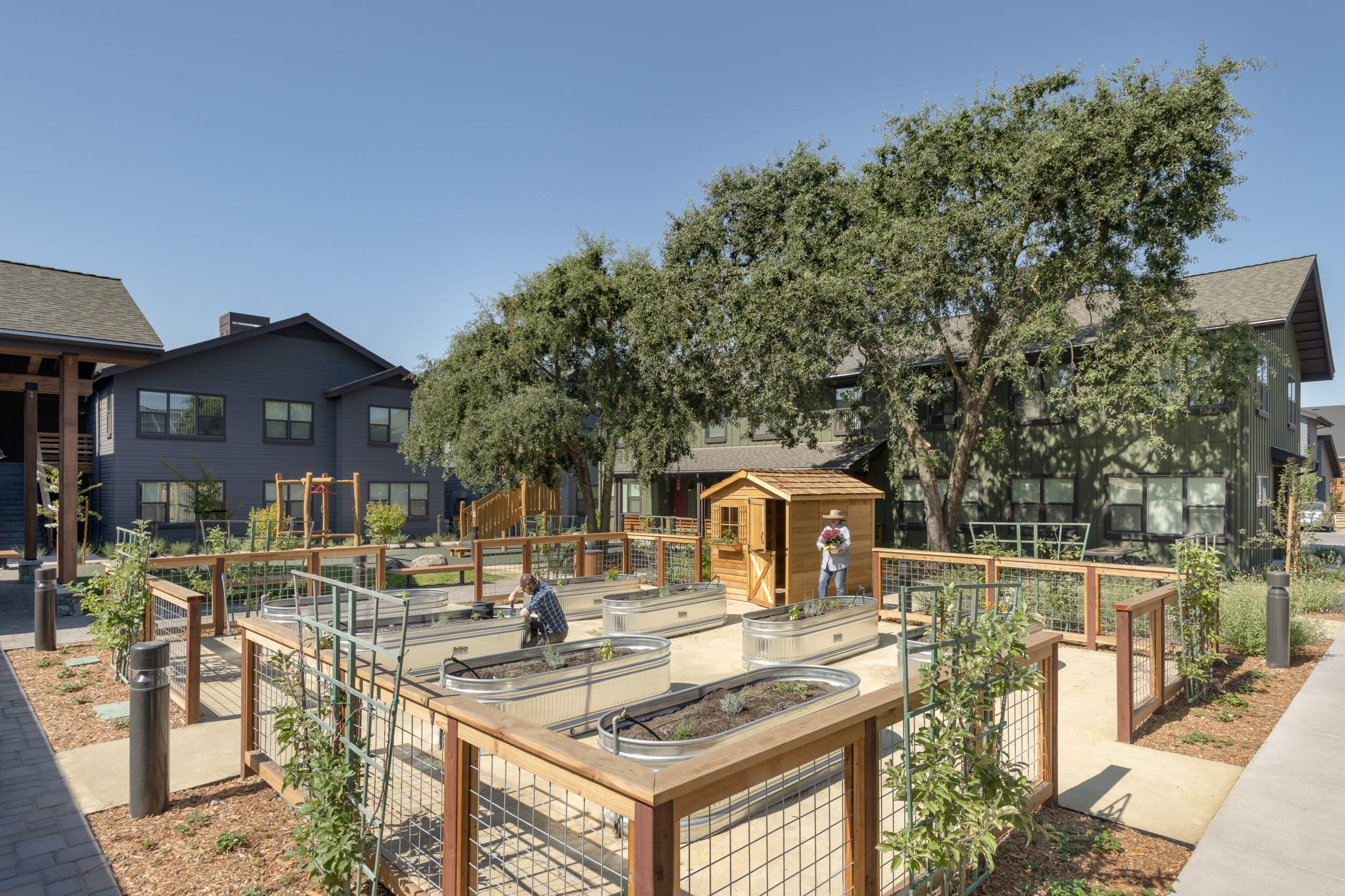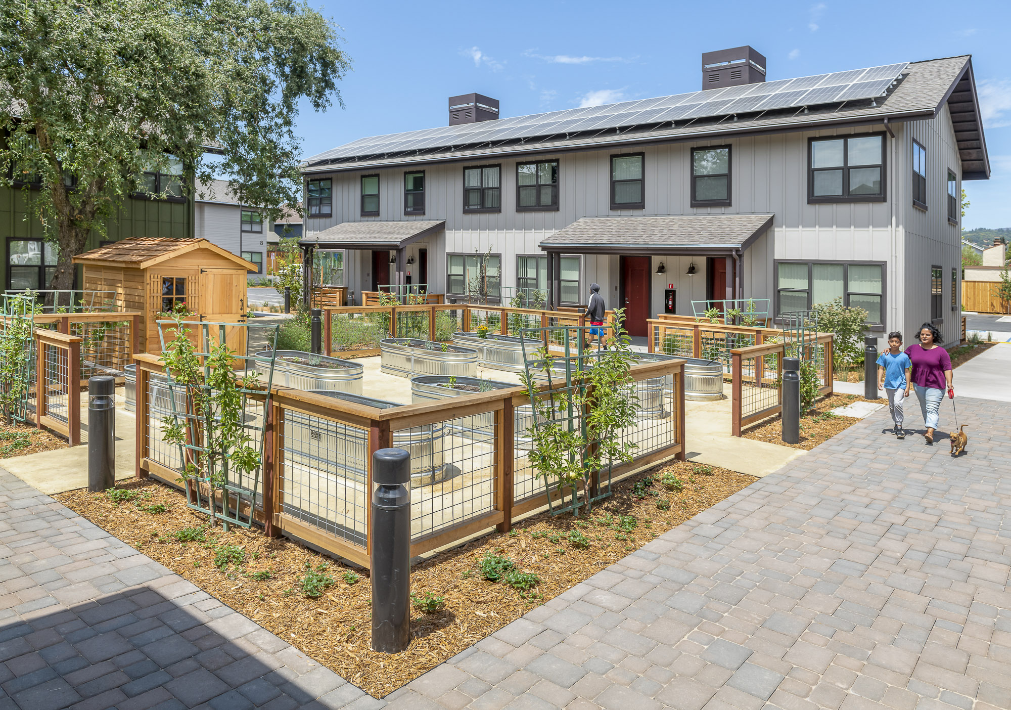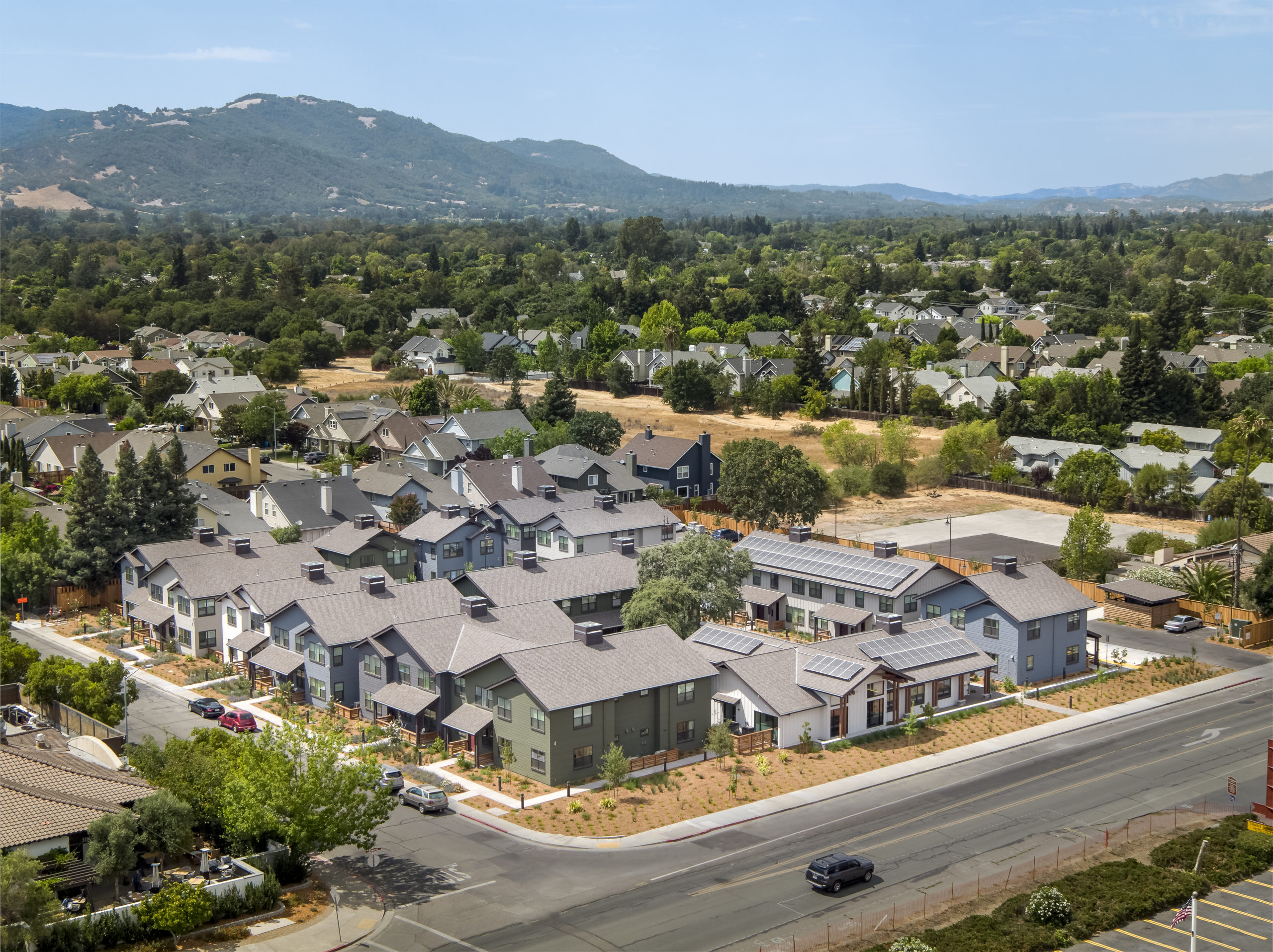 Alta Madrone (formerly known as “Altamira”) is located at the southern gateway of the City of Sonoma. The site was identified as an affordable housing opportunity site in the City of Sonoma Housing Element. In January 2016, SAHA was selected to be the developer of this affordable family community. After a two-year community engagement process, Alta Madrone received full approval from city planning in February 2018. Alta Madrone will provide 48 units of 100% affordable housing for families from Sonoma County. The site has eight residential buildings with one, two, and three bedroom apartments as well as a single community building with community room, offices, covered bicycle storage and laundry facilities. Extra attention has been paid to the landscaping of this site, with open space central to the property, children’s playground, bay-friendly landscaping and mature trees and shrubs to enhance privacy and overall comfort for the existing neighbors and new residents.